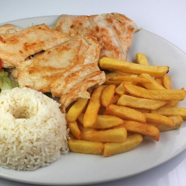 Acompañado de arroz, papas y ensalada.
